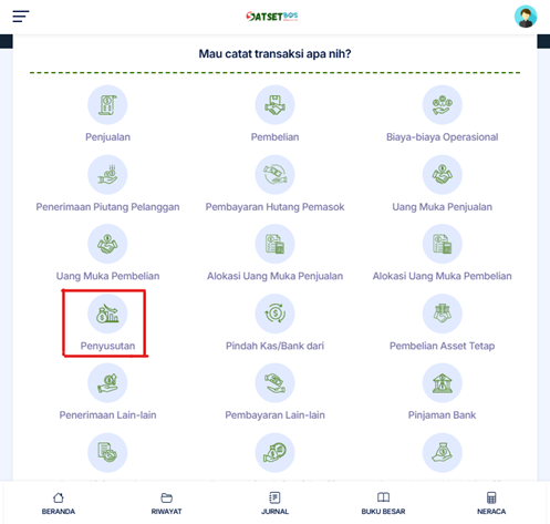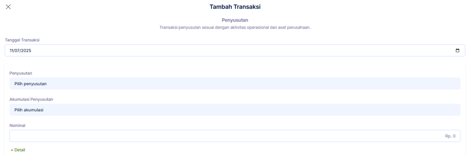 Setelah klik menu Penyusutan. Anda bisa menginput transaksi Penyusutan. Anda wajib isi Tanggal transaksi, Pilih Penyusutan, pilih Akumulasi Penyusutan, Nominal.