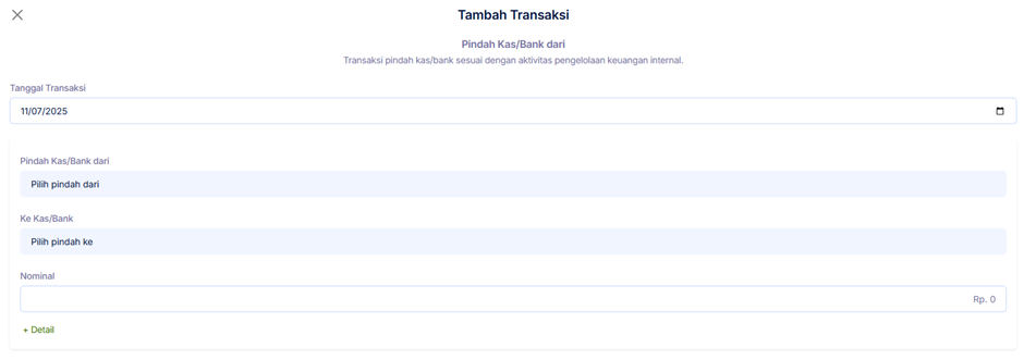Setelah klik menu Pindah Kas/Bank Dari. Anda bisa menginput transaksi Pindah Kas/Bank Dari. Anda wajib isi Tanggal transaksi, Pilih Pindah Kas/Bank Dari, pilih Ke Kas/Bank, Nominal.