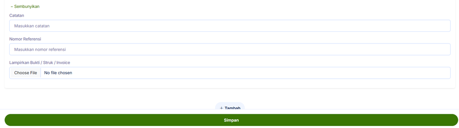 Selanjutnya Anda bisa klik Detail. Untuk isi catatan, Nomor Referensi, dan Lampirkan bukti. Lalu Anda bisa klik tambah untuk menambahkan transaksi penginputan dan bisa klik Simpan.