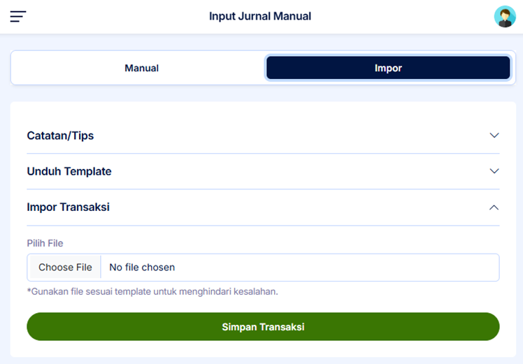 Setelah menyesuaikan header yang sudah ada di template excel, Anda bisa klik Impor Transaksi. Lalu anda pilih file tamplate excel yang sudah di sesuaikan, kemudian klik Simpan Transaksi.