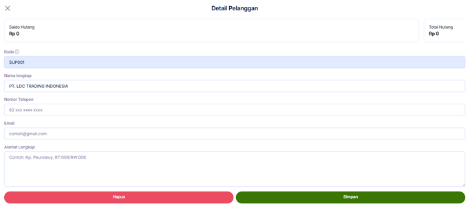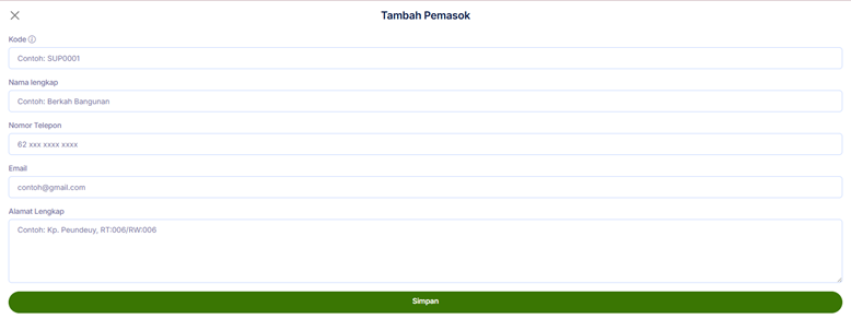 5. Selanjutnya anda bisa menambahkan Pemasok. Isi Kode Pemasok, Nama Pemasok, Nomor Telepon, Email, Alamat Lengkap. lalu klik Simpan.