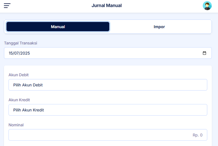 2. Setelah klik menu Jurnal Manual. Anda bisa menginput transaksi Jurnal Manual. Anda wajib isi Tanggal transaksi, Pilih Akun Debit, Pilih Akun Kredit, Nominal.