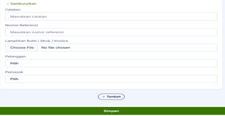 3. Selanjutnya anda bisa klik Detail. Untuk isi catatan, Nomor referensi, Lampirkan bukti, pilih Pelanggan dan pilih pemasok. Lalu Anda bisa klik tambah untuk menambahkan transaksi penginputan dan bisa klik Simpan.