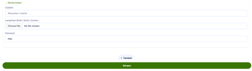Selanjutnya Anda bisa klik Detail. Untuk isi catatan, Lampirkan bukti, dan pilih Pemasok. Lalu Anda bisa klik tambah untuk menambahkan transaksi penginputan dan bisa klik Simpan.