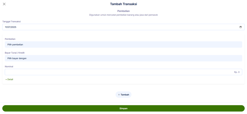 Setelah klik menu Pembelian. Anda bisa menginput transaksi Pembelian. Anda wajib isi Tanggal transaksi, Pilih pembelian, pilih bayar tunai atau Kredit, Nominal.