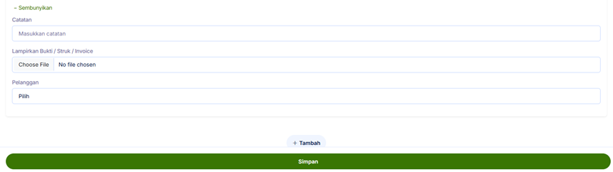 Selanjutnya anda bisa klik Detail. Untuk isi catatan, Lampirkan bukti, dan pilih Pelanggan. Lalu Anda bisa klik tambah untuk menambahkan transaksi penginputan dan bisa klik Simpan.