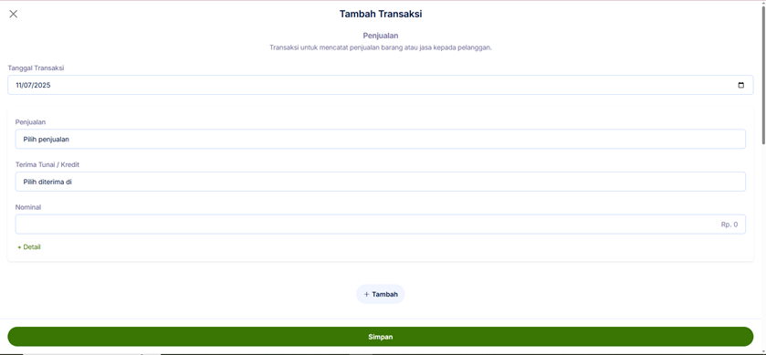 Setelah klik menu Penjualan. Anda bisa menginput transaksi Penjualan. Anda wajib isi Tanggal transaksi, Pilih penjualan, terima tunai atau Kredit, Nominal.