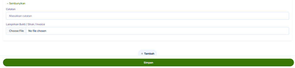 • Selanjutnya Anda bisa klik Detail. Untuk isi catatan dan Lampirkan bukti. Lalu Anda bisa klik tambah untuk menambahkan transaksi penginputan dan bisa klik Simpan.