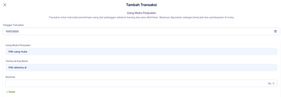 Setelah klik menu Uang Muka Penjualan. Anda bisa menginput transaksi Uang Muka Penjualan. Anda wajib isi Tanggal transaksi, Pilih Uang Muka Penjualan, pilih Terima Tunai atau Kredit, Nominal.