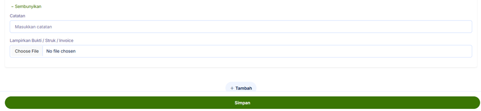 Selanjutnya Anda bisa klik Detail. Untuk isi catatan dan Lampirkan bukti. Lalu Anda bisa klik tambah untuk menambahkan transaksi penginputan dan bisa klik Simpan.