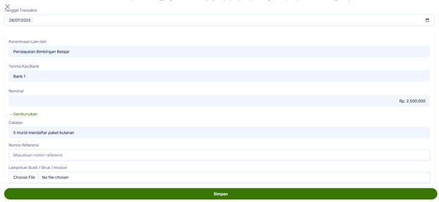 Misal tanggal 24 Juli 2025, ada 5 murid mendaftar paket bulanan Rp 500.000.