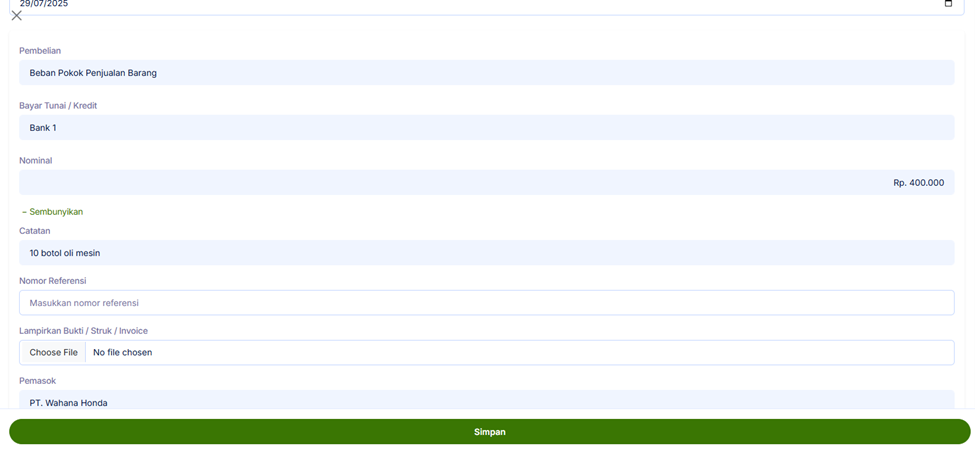 Pembelian 10 botol oli mesin pada tanggal 19 Juli 2025 seharga Rp 400.000.