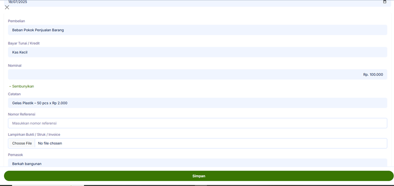 Contoh : beli 50 pcs Gelas Plastik @Rp 2.000 = Rp 100.000 tunai.