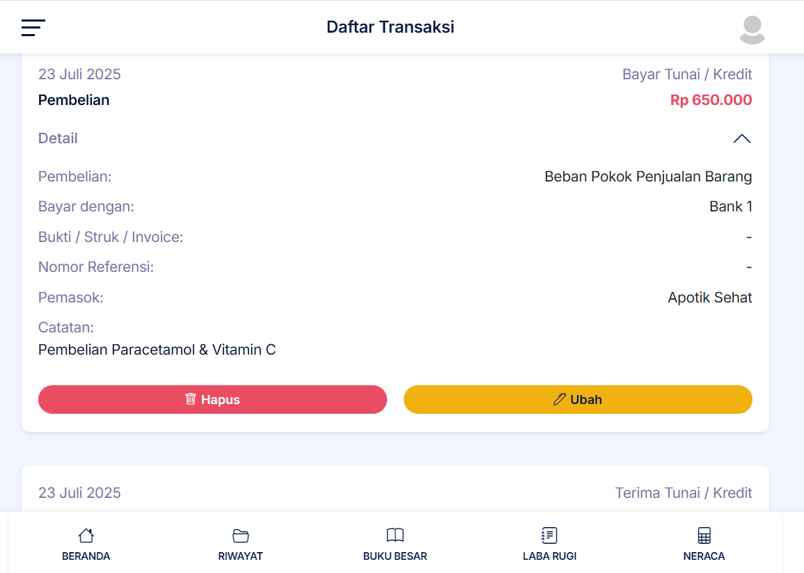 • Lihat Riwayat, lalu bisa edit / hapus transaksi bila perlu.