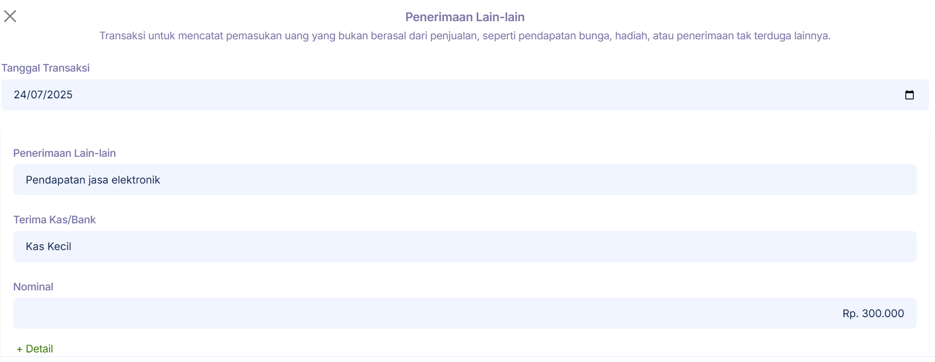 2) Pilih Penerimaan Lain – Lain : Pendapatan Jasa Service Elektronik