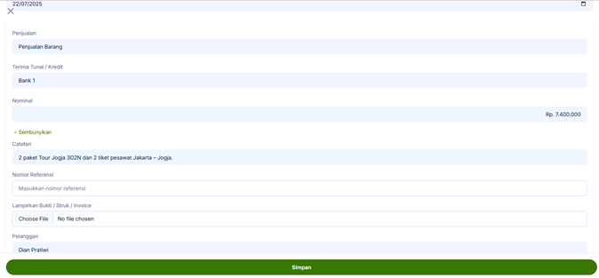 Pada tanggal 22 Juli 2025, seorang pelanggan memesan 2 paket Tour Jogja 3D2N dan 2 tiket pesawat Jakarta – Jogja.